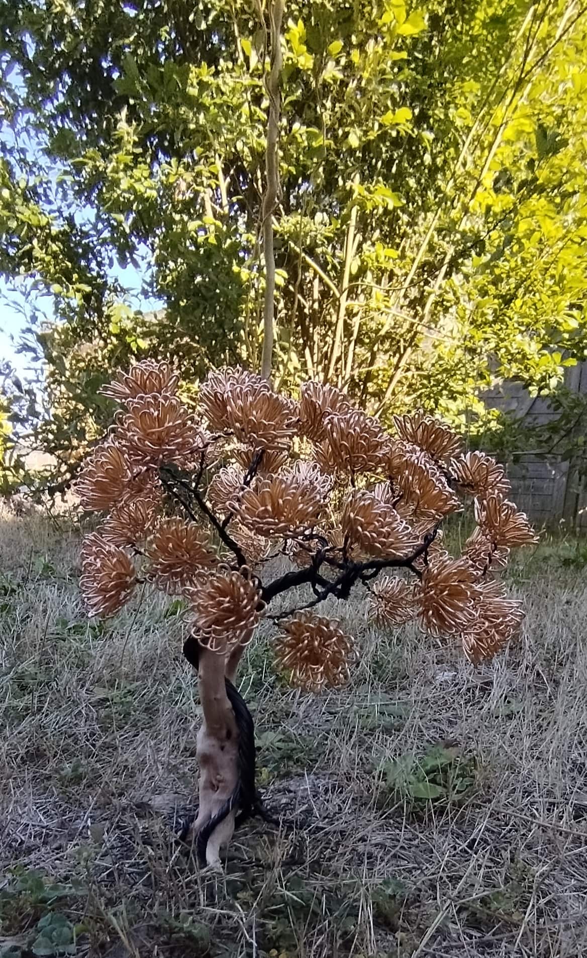 Les fleurs dorées en fil de métal, délicatement façonnées, captent la lumière et offrent un rendu à la fois chaleureux et raffiné. Le tronc sculpté à la main, aux courbes naturelles, évoque la force et l’équilibre de la nature. Aucune création n’est identique, faisant de cet arbre une œuvre d’art originale et exclusive.