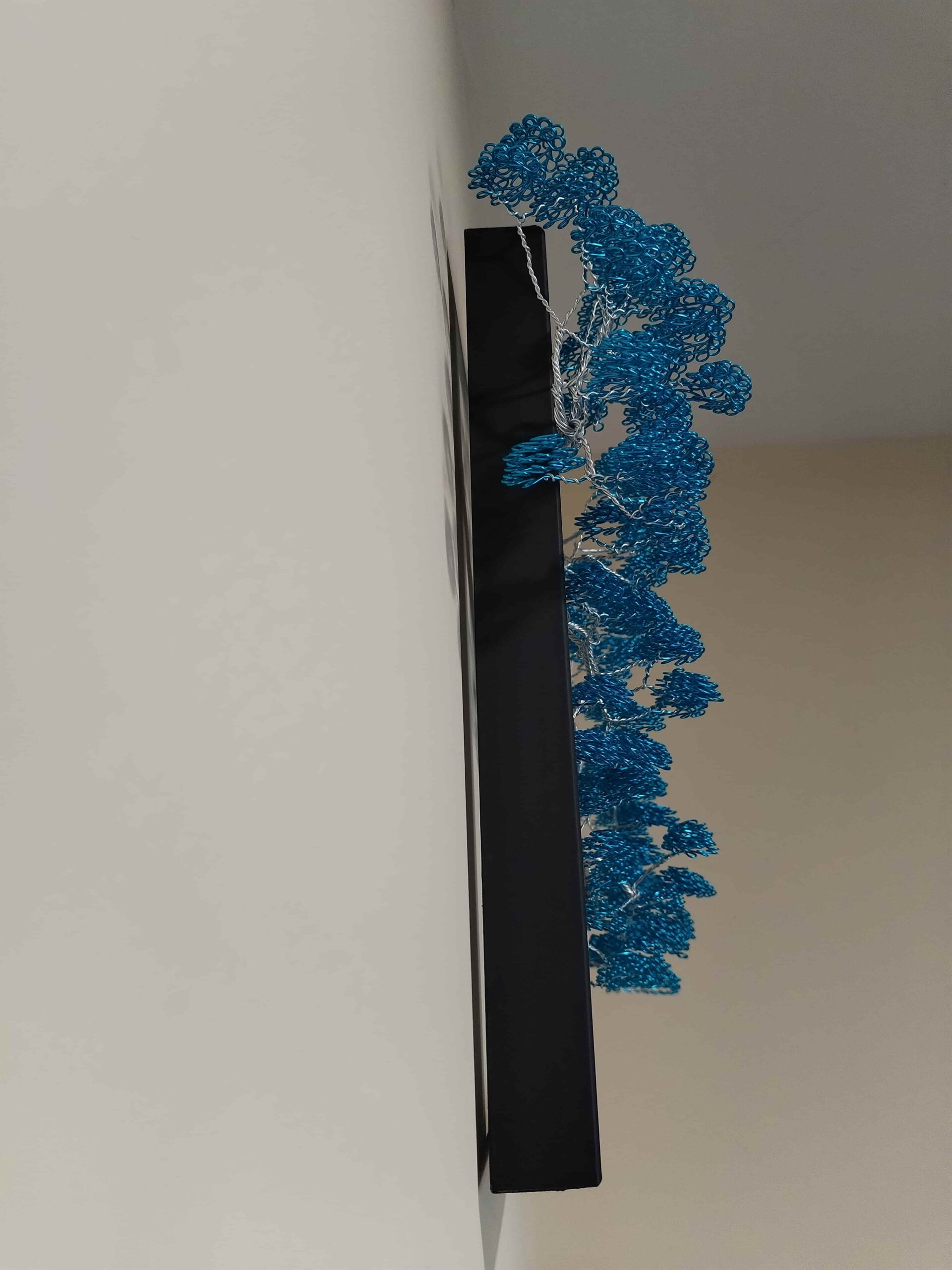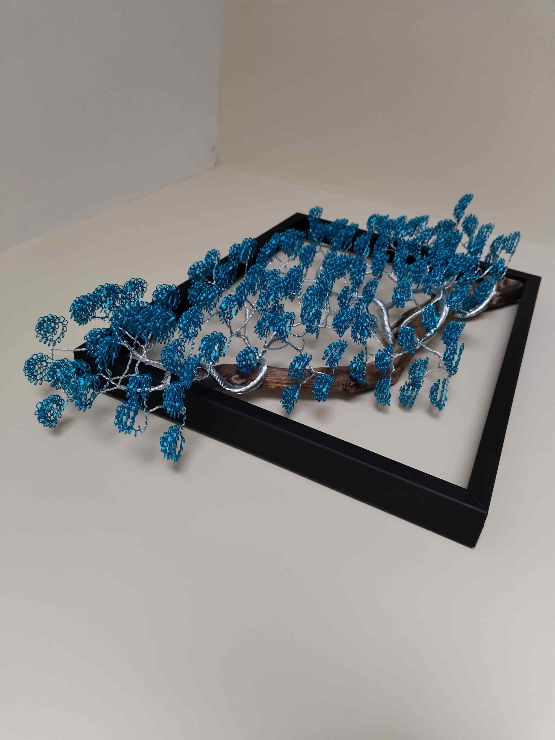 L’arbre s’étire harmonieusement sur un morceau de bois naturel, créant un contraste élégant entre la matière brute et la légèreté du fil métallique. L’ensemble est sublimé par un grand cadre noir, sobre et moderne, qui met en valeur l’œuvre tout en s’intégrant parfaitement dans une décoration intérieure design, bohème ou minimaliste.